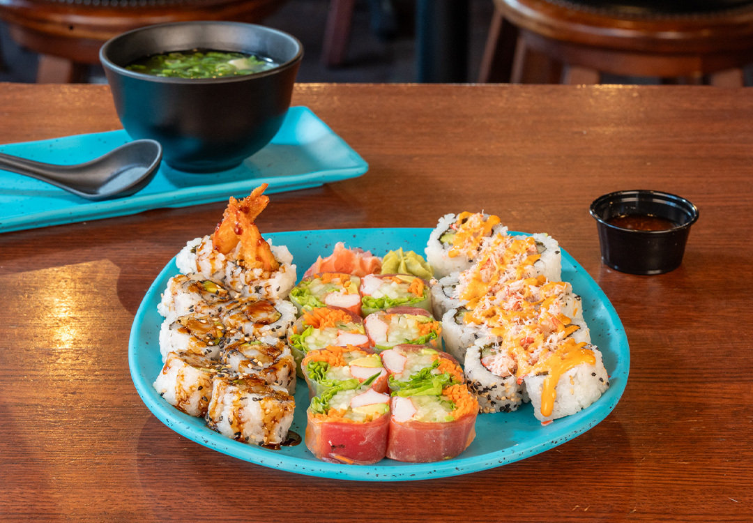 An order of our three most popular rolls on a sharable platter: Spicy Cali, Tempura Shrimp & Tuna Spring; Served with miso soup 25.49