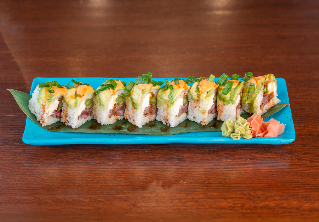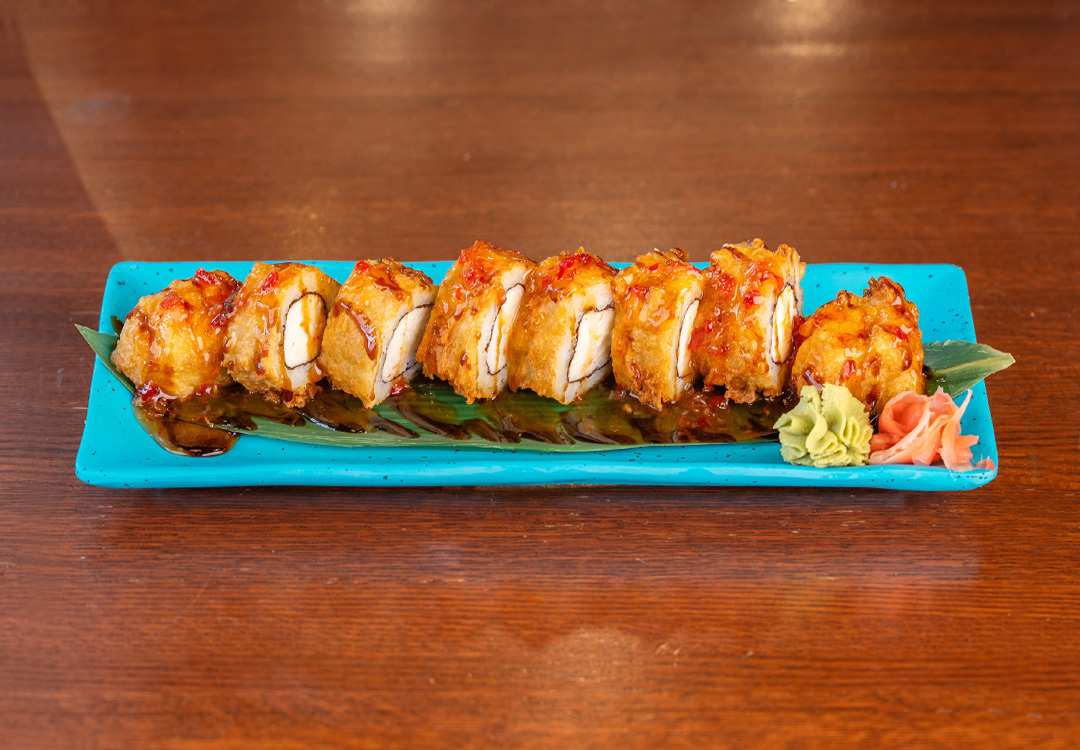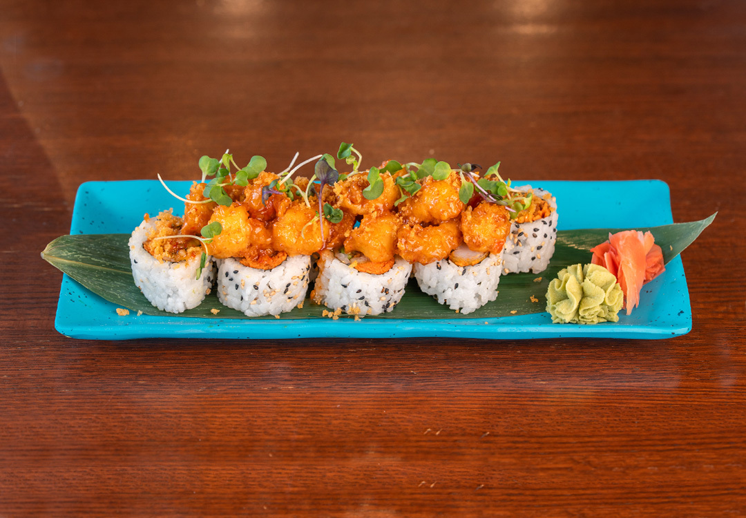 Tempura shrimp, avocado, seaweed, sushi rice, sesame seeds; topped with sushi sauce 10.49