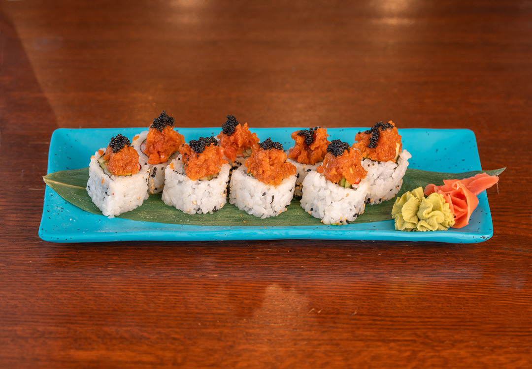 Crab stick, sushi rice, cucumber, avocado, tempura crunch, spicy mayo, sushi sauce, red tobiko, microgreens 15.49