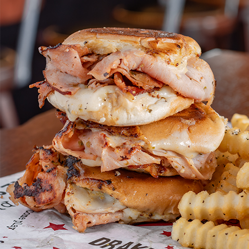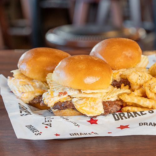 <span class="gg-bbsotm-description">Three Drake's butcher blend Old Bay-seasoned patties with pimento cheese, potato chips, pickles & mayo on warm butter-toasted buns; choice of side. <span class="gg-bbsotm-price">$14.99</span><br />2 minis <span class="gg-bbsotm-price">$13.49</span>