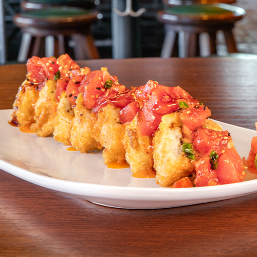 <span class="gg-bbsotm-description">Crab rangoon mix, sweet chili sauce & spicy mayo rolled in seaweed & sushi rice & tempura-fried; topped with marinated tuna. <span class="gg-bbsotm-price">$13.99</span>