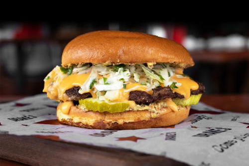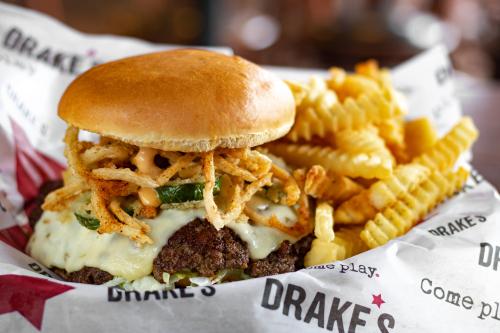 Drake’s butcher blend patty with pepper jack cheese, fried jalapeños, sriracha onion straws, shredded lettuce, BBQ sauce, & BBQ mayo on a warm butter-toasted bun; served with chips.